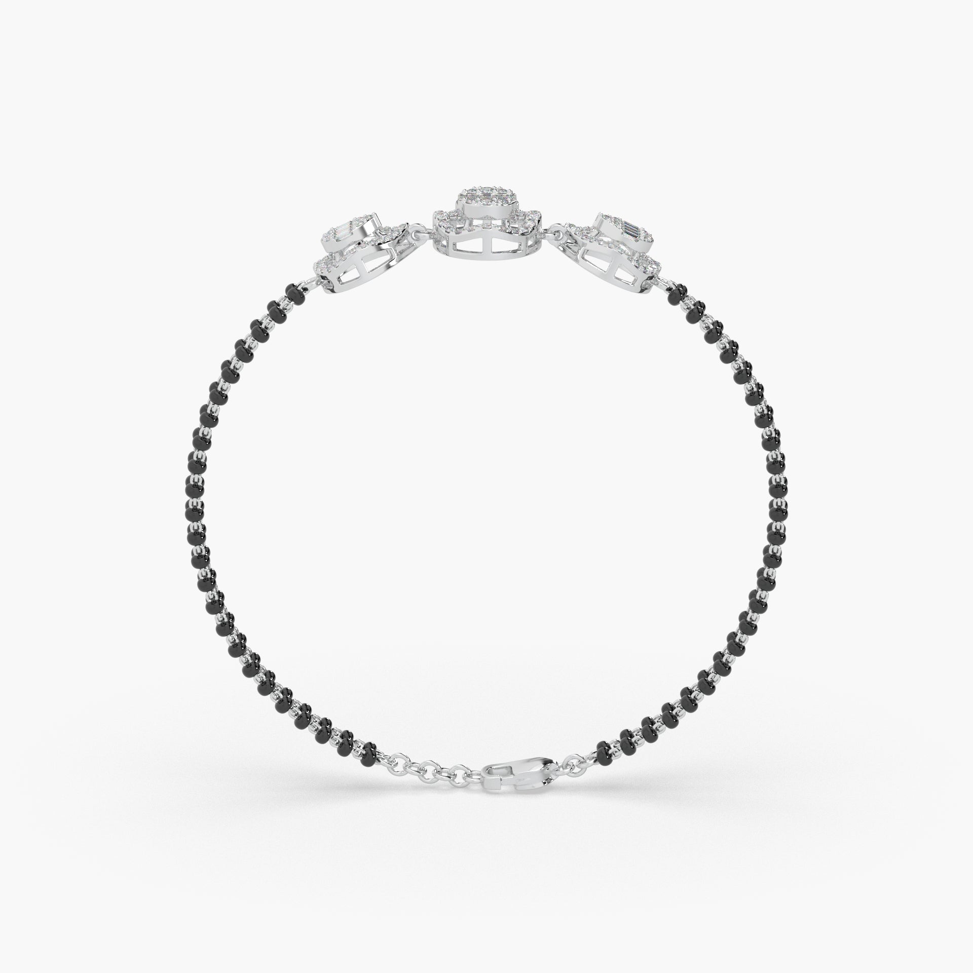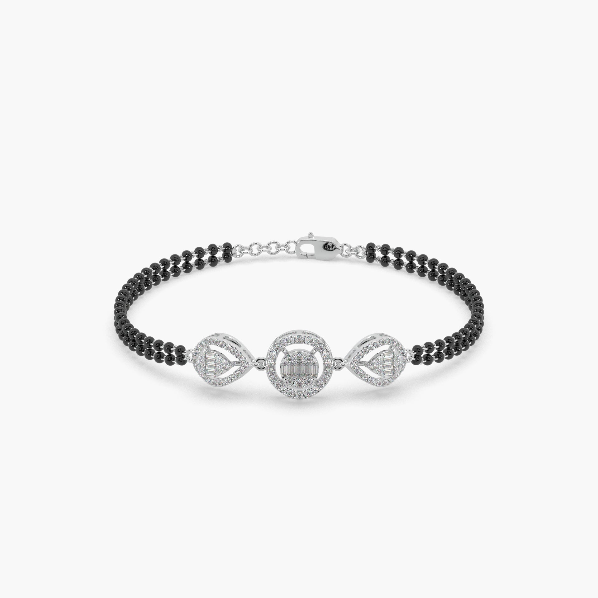 Meticulously crafted from high-polish 925 sterling silver, this bracelet gracefully incorporates the auspicious black beads or accents, traditional to the Mangalsutra, alongside a magnificent array of expertly set diamond studs. The exceptional craftsmanship and dazzling brilliance create a truly beauteous silver Mangalsutra bracelet that is a feast for the eyes.