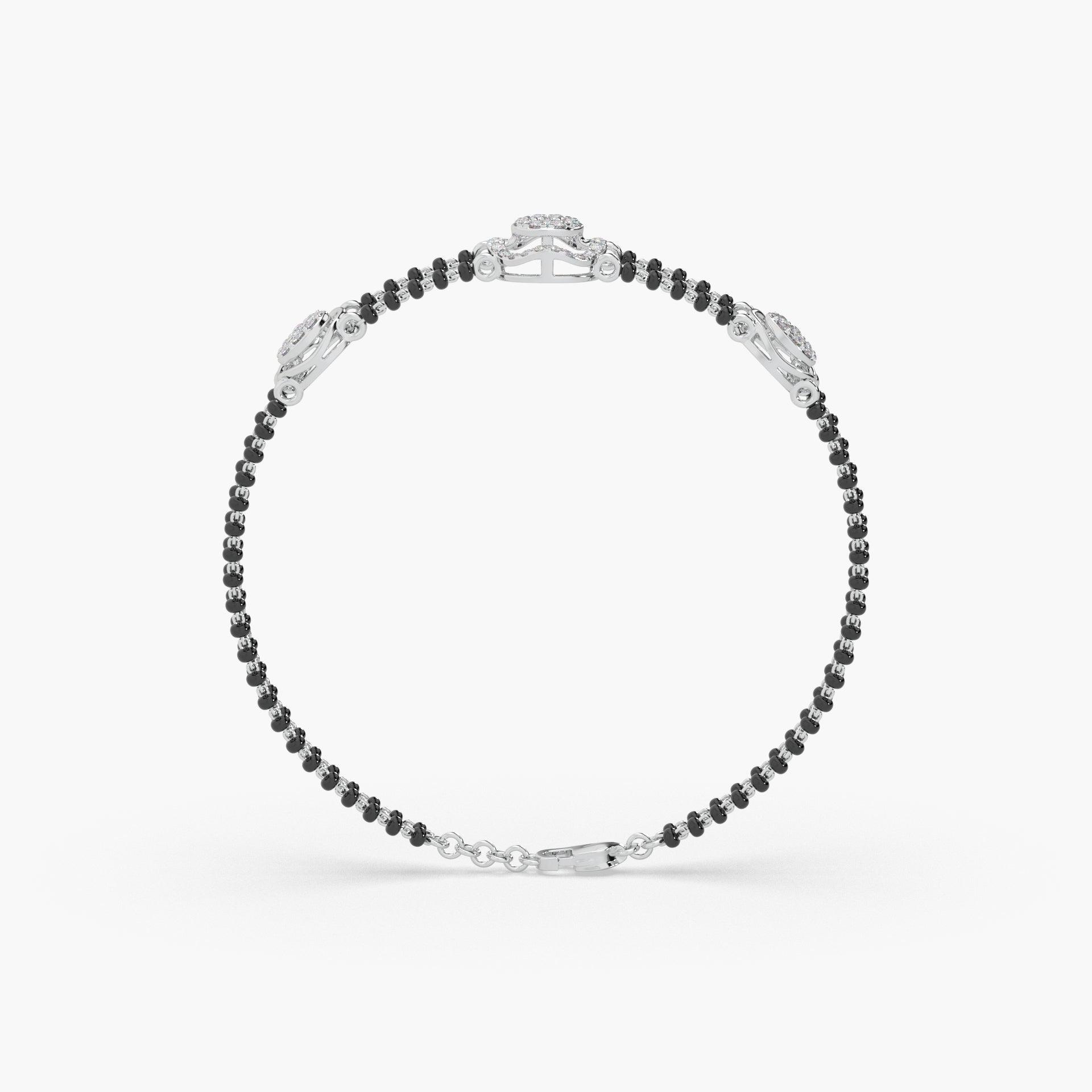 Meticulously crafted from high-polish 925 sterling silver, this bracelet features a carefully curated pattern that incorporates the customary black beads (or enamel accents) alongside a stunning, distinctive arrangement of brilliant diamond studs. The unique design and superior craftsmanship ensure this is an exclusive silver Mangalsutra bracelet unlike any other.