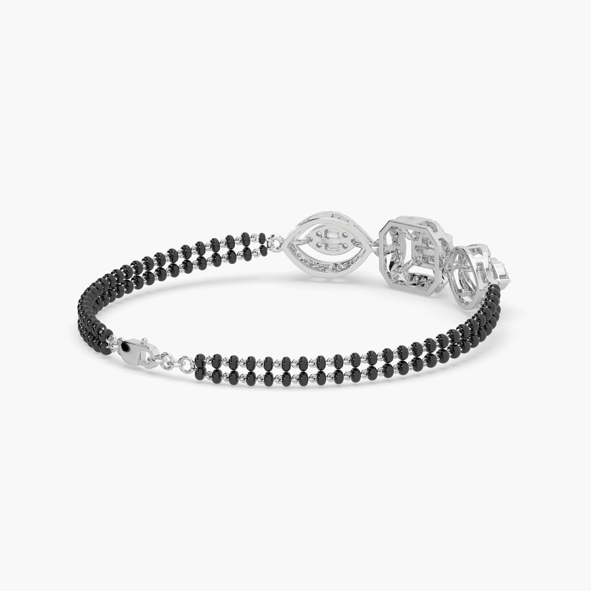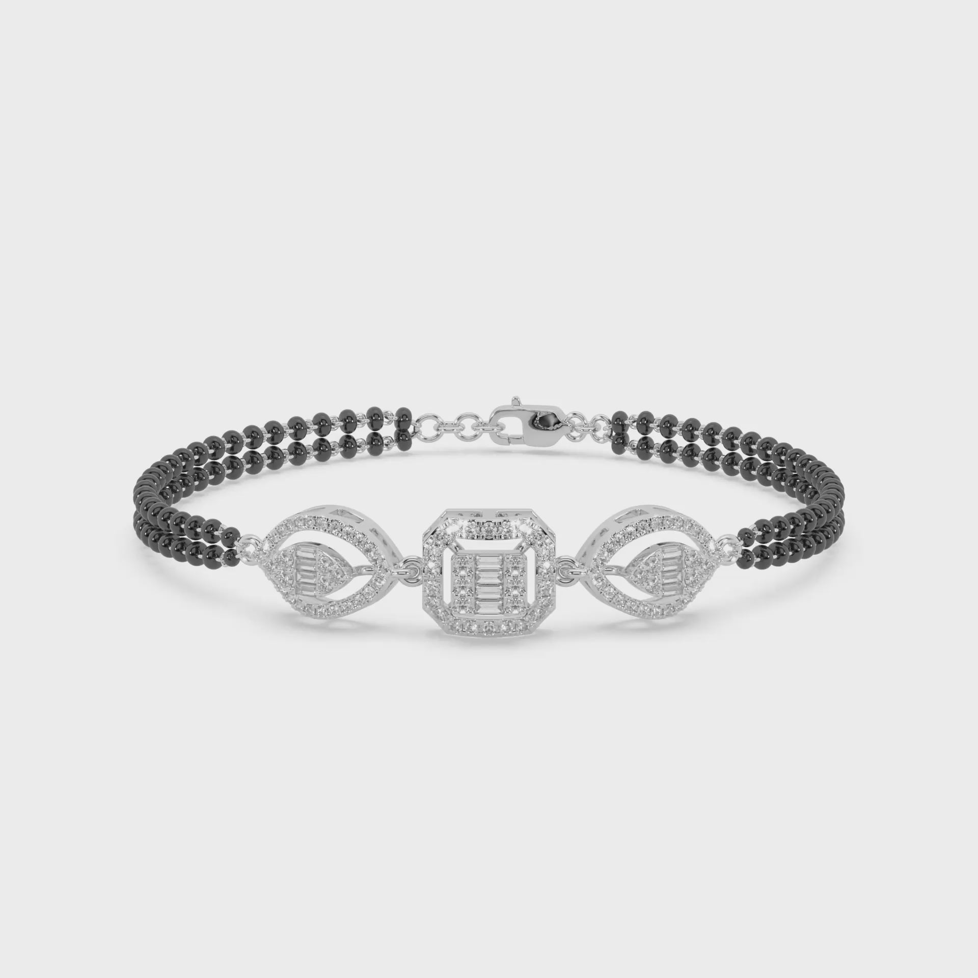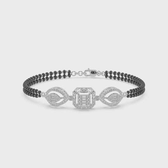Expertly crafted from high-quality, radiant 925 sterling silver, this piece gracefully integrates the auspicious black beads or accents, which are central to the Mangalsutra's meaning, alongside a brilliant centerpiece of sparkling diamond studs. The design allows the Hand Mangalsutra Bracelet to be comfortably worn, offering a distinctive, modern way to honor tradition.
