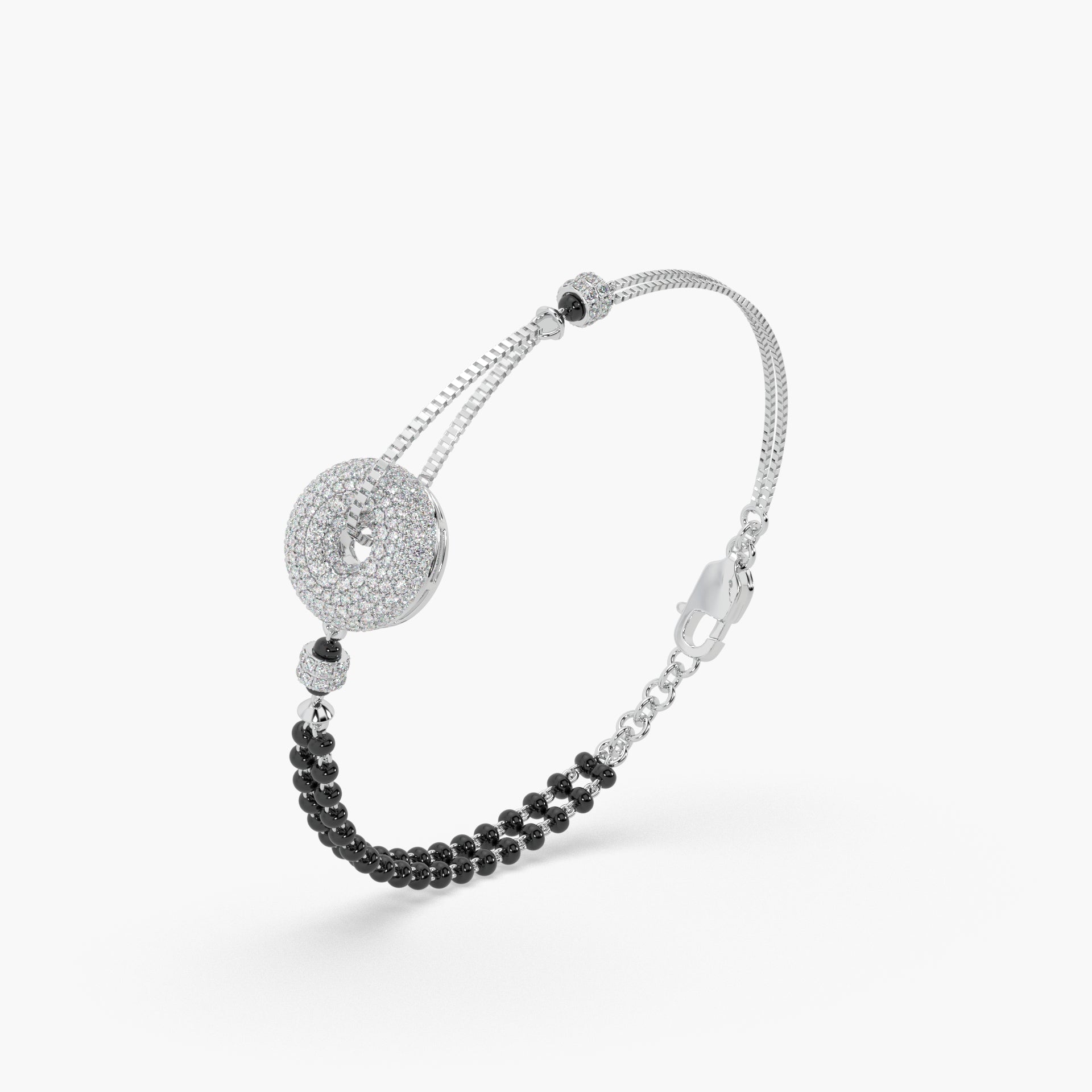 Meticulously crafted from high-quality 925 sterling silver, this bracelet features the traditional small black beads (or enameled accents) alongside dazzling, brilliant diamond studs. The diamonds are expertly set to add luxurious sparkle, elevating the design while honoring the spirit of the Mangalsutra.