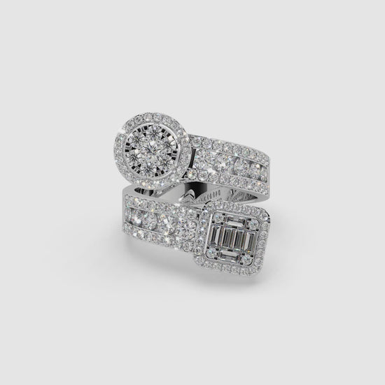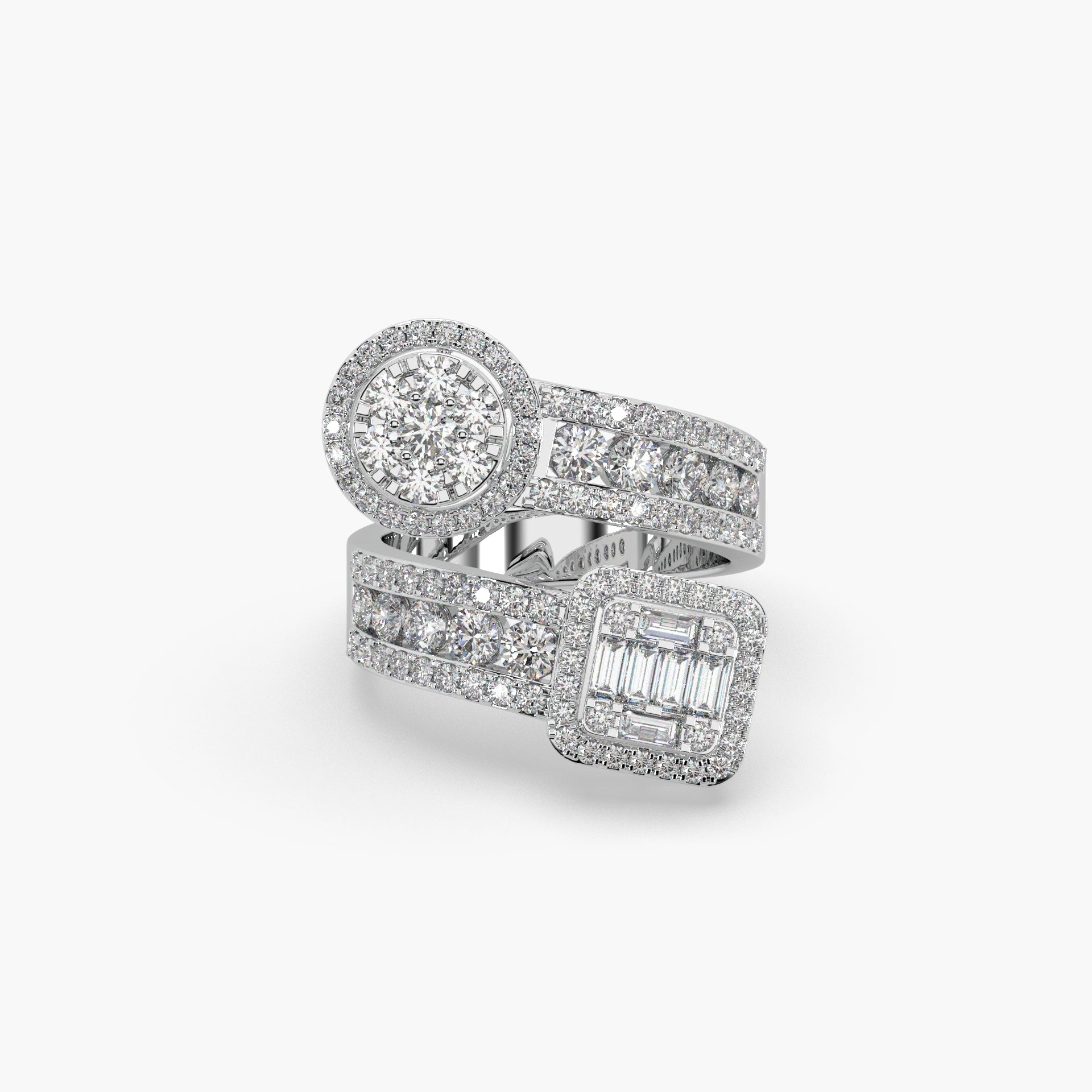 Expertly crafted from radiant 925 sterling silver, this ring showcases a beautifully intricate arrangement. It combines the intense, symmetrical sparkle of Round Studs with the sleek, architectural lines of Baguette Studs. This fusion of shapes creates a truly fascinating, multidimensional shimmer and a unique, eye-catching design that feels both timeless and distinctly contemporary.